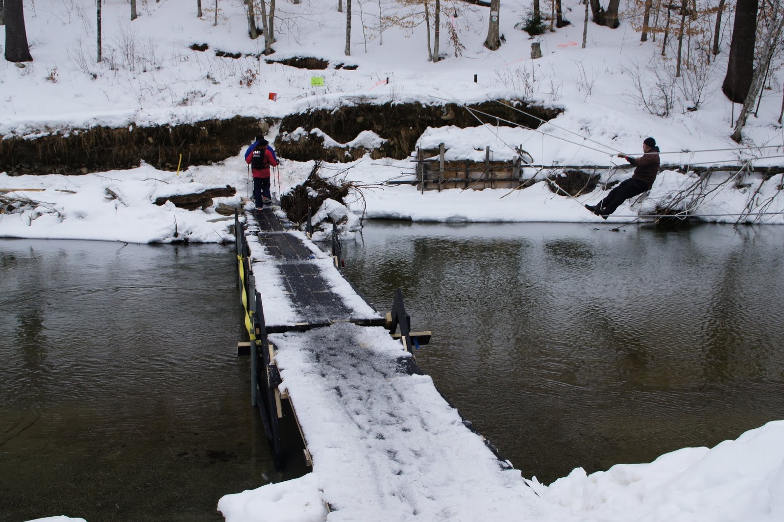 The morning went smoothly, and the half marathon race went off at 8:30 AM, (marathon at 8, 10k at 9). The start was a little tricky, we started out in front of the barn on the dirt road headed into the parking lot, but almost immediately funneled into singletrack, with deep snow on the sides that made it hard to pass. I got stuck behind some people here, but was able to get around most of them fairly quickly. I had no clue where I was in relation to the pack, but just started running steadily and felt strong. We had to cross a narrow bridge built across the river to get into the woods and start the lap – luckily I got there with very little traffic and had uneventful crossings 🙂